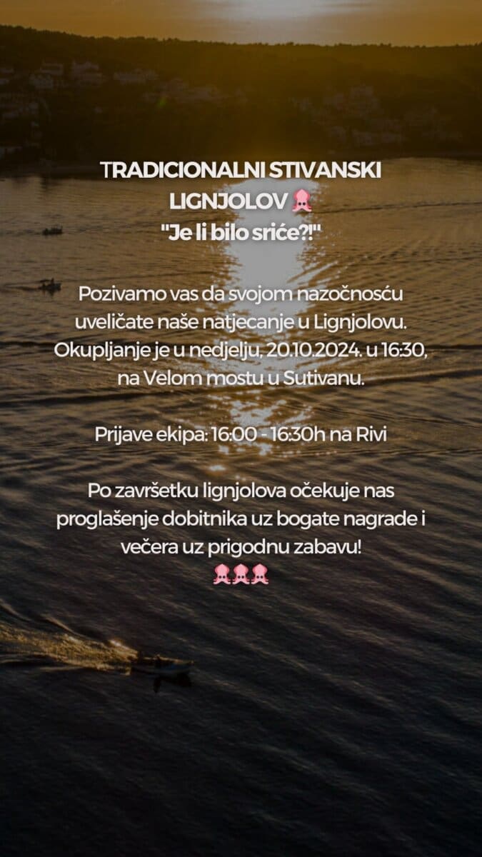 U Sutivanu će ove nedjelje, 20. listopada 2024. godine, biti održano popularno natjecanje u lignjolovu, pod nazivom "Je li bilo sriće?". Okupljanje sudionika zakazano je u 16:30 sati na Velom mostu u Sutivanu, a prijave ekipa bit će moguće od 16:00 do 16:30 sati na Rivi.