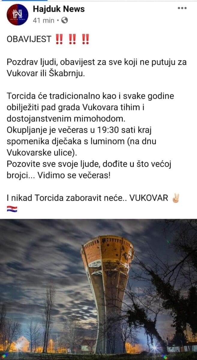 "Obavijest za sve koji ne putuju za Vukovar ili Škabrnju. Tradicionalno će se kao i svake godine obilježiti pad grada Vukovara tihim i dostojanstvenim mimohodom.
