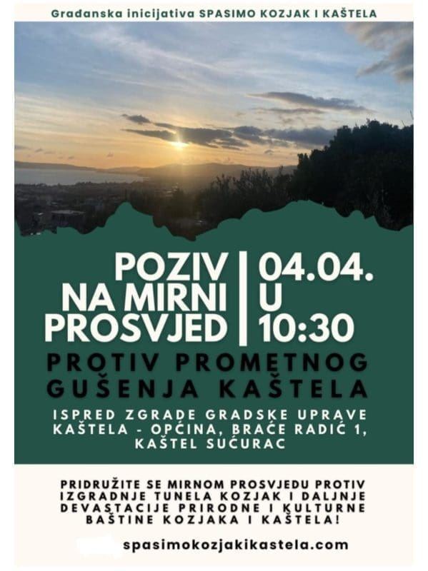 Na Javnoj tribini koja se održala sinoć u dvorcu Vitturi u Kaštel Lukšiću, Građanska inicijativa Spasimo Kozjak i Kaštela pozvala je građane Kaštela da se pridruže mirnom prosvjedu koji će se održati ispred gradske uprave u Kaštel Sućurcu, 4. travnja u 10.30 sati.