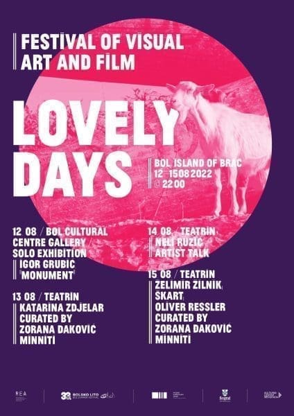 Festival vizualne umjetnosti i filma Lovely Days i ove godina održava se uz podršku Centra za kulturu Općine Bol i u sklopu kulturne manifestacije 33. Bolsko lito. Svi programi počinju u 22 sata u prostorijama Galerije Centra za kulturu Bol i Teatrina Dva ferala, uz besplatan ulaz.