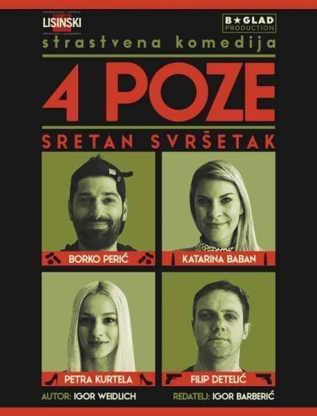 Borko Perić, Katarina Baban, Petra Kurtela i Filip Detelić - glumačka su ekipa koja oduševljava gledatelje. Komedija "4 POZE, sretan svršetak" najveći je kazališni hit ovog ljeta na "Teatru uz more" u Splitu. Već prva izvedba bila je dovoljna da se pronese glas o predstavi koja se mora pogledati te ova vesela glumačka ekipa otada ne prestaje nizati rasprodana gledališta. Samo u Splitu, na Teatru uz more, predstava je rasprodana čak pet puta u posljednja tri mjeseca a u utorak 28. rujna gostuje u Makarskoj.