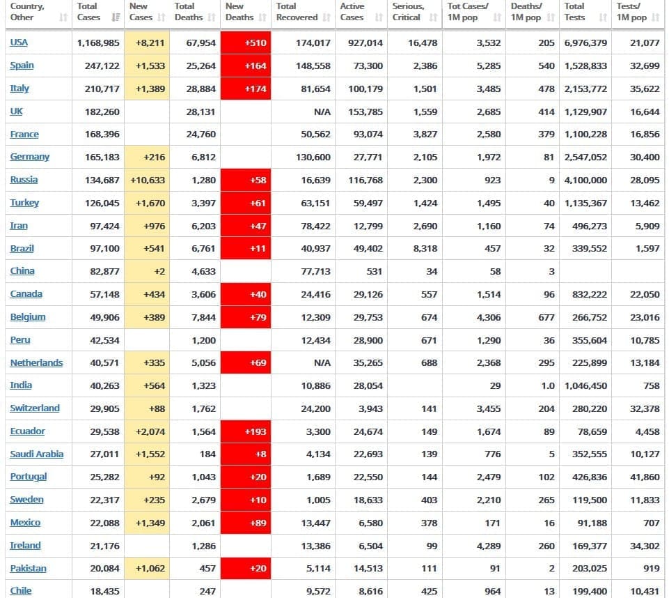 U Rusiji je zadnja 24 sata evidentirano 10.633 novozaraženih i 58 umrlih. Podaci za SAD će se znatno večeras, a s problemima se suočava Ekvador koji broji 2.074 novooboljela i 193 umrla.