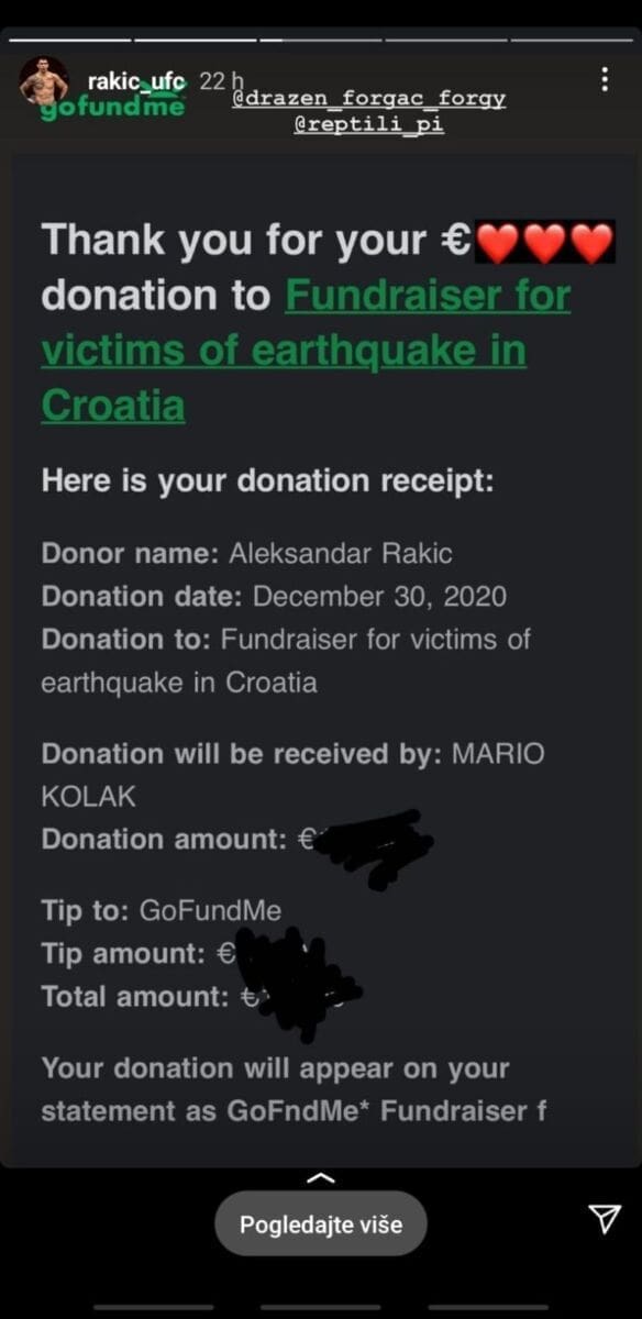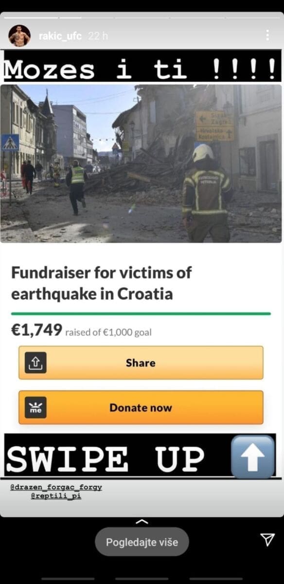 Aleksandar Rakić, najbolji srpski MMA borac i zvijezda UFC-ove poluteške kategorije, pokazao je da ima veliko srce. Na svojem Instagram profilu pozvao je pratitelje da doniraju novac za stradale u velikom potresu u središnjoj Hrvatskoj te je i sam uplatio novac.