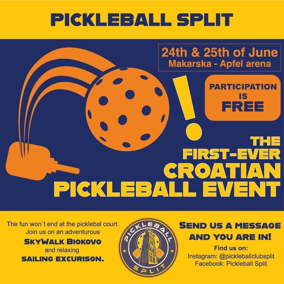 Zahvaljujući zaljubljenicima u pickleball, mahom našim ljudima iz SAD-a i Kanade, pickleball je stigao u Hrvatsku. Već se igra u Zagrebu i Slavonskom Brodu, a sada je došao i u Split. U organizaciji Pickleball kluba Split sljedećeg vikenda (24. i 25. lipnja) u Apfel Areni u Makarskoj održat će se prvi hrvatski pickleball event.