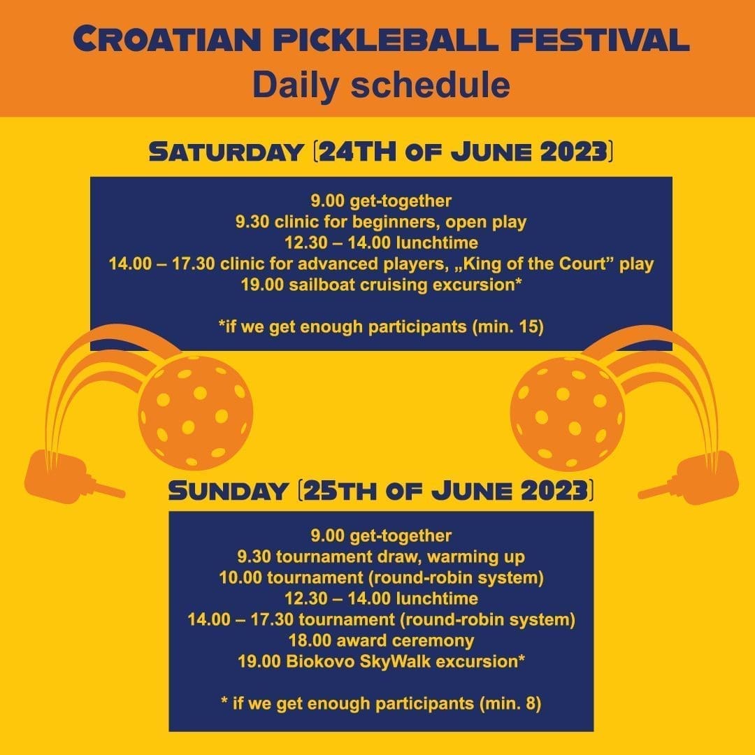 Nakon pickleballa bit će organizirani izleti koji ovom događaju daju i turističku notu. Cilj organizatora je da Dalmacija postane pickleball središte ne samo Hrvatske, već i ovog dijela Europe. Za prvi događaj Pickleball kluba Split već se prijavilo više od 50 sudionika iz čak sedam različitih zemalja (Hrvatska, Kanada, Njemačka, Belgija, Češka, Italija, Španjolska).