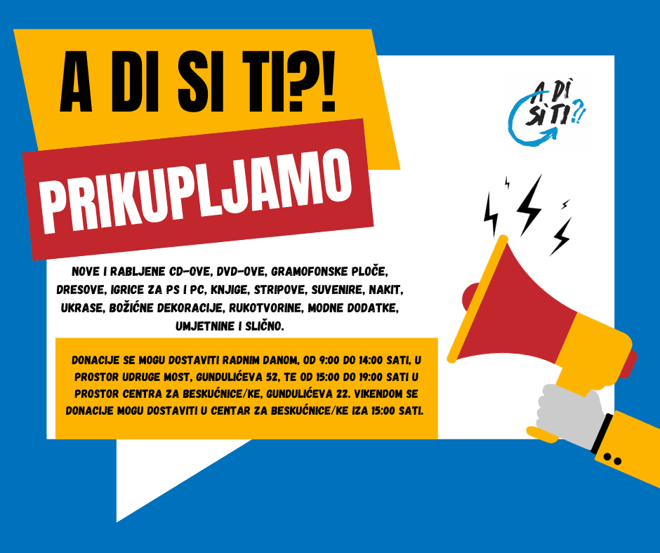 Donacije se mogu dostaviti radnim danom, od 9 do 14 sati, u prostor udruge MoSt, Gundulićeva 52, te od 15 do 19 sati u prostor Centra za beskućnice/ke, Gundulićeva 22.