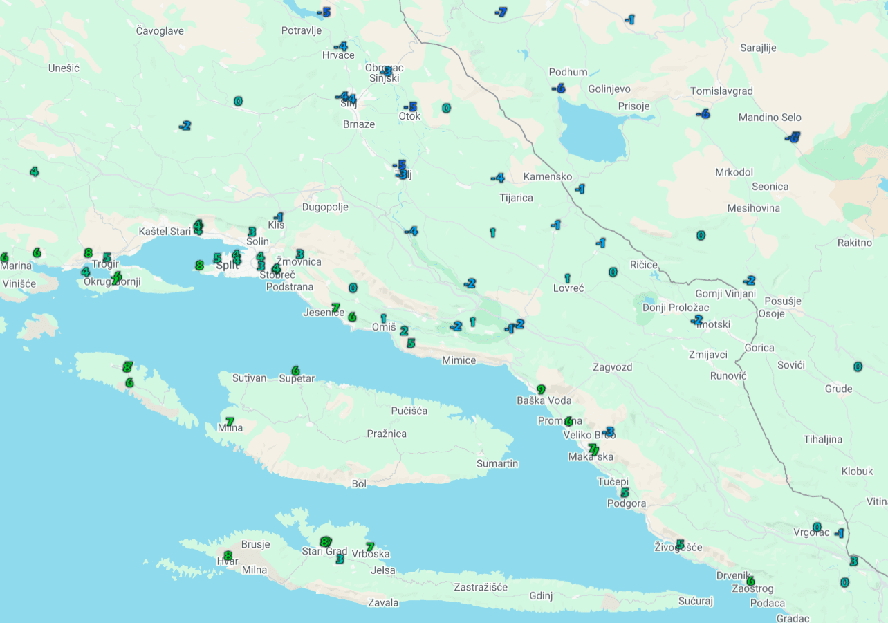Jutros u 10 sati Dalmacija je imala znatne temperaturne razlike između obale i unutrašnjosti. U obalnim gradovima zabilježene su temperature iznad nule: u Zadru i Šibeniku oko 4–5 °C, u Splitu, Trogiru i na Hvaru oko 8 °C, u Makarskoj i na Braču (Bol) oko 7 °C, dok je u Omišu izmjereno oko 6 °C.