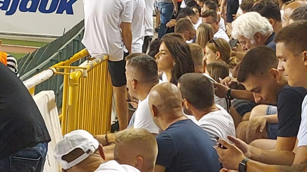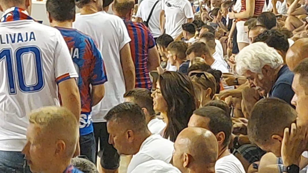 Zauzela je mjesto na zapadnoj tribini i to u prvom redu. Naravno da nije prošla nezapaženo u mnoštvu muškaraca. Utakmicu prati u bijelom topiću i bijelim kratkim hlačama.