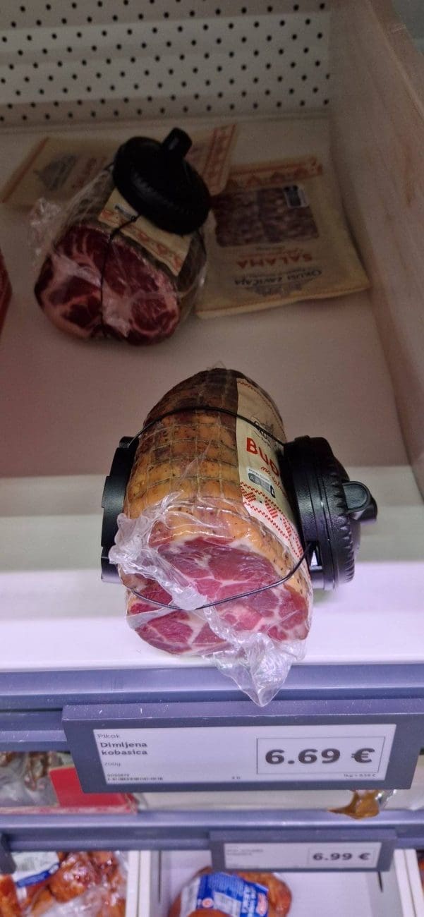 Na slici se jasno vidi suhomesnata delicija, buđola, i to u komadu sa zaštitom od krađe, snimljena na polici jedne Lidlove trgovine. Iako se ovakvi sigurnosni uređaji obično viđaju na alkoholnim pićima i/ili elektronici, pojava zaštite na prehrambenom proizvodu iznenadila je mnoge.