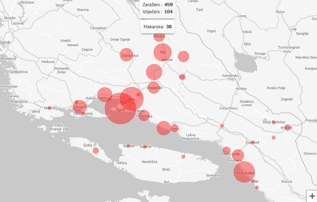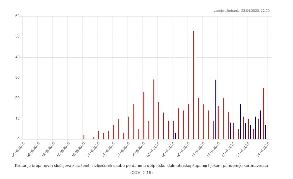 Na području Splitsko dalmatinske županije do sada su zabilježena 462 slučaja zaraze koronavirusom od toga je 117 osoba izliječeno te je na dan 24.04.2020. na području Splitsko dalmatinske županije pozitivno na COVID infekciju 345 osoba.