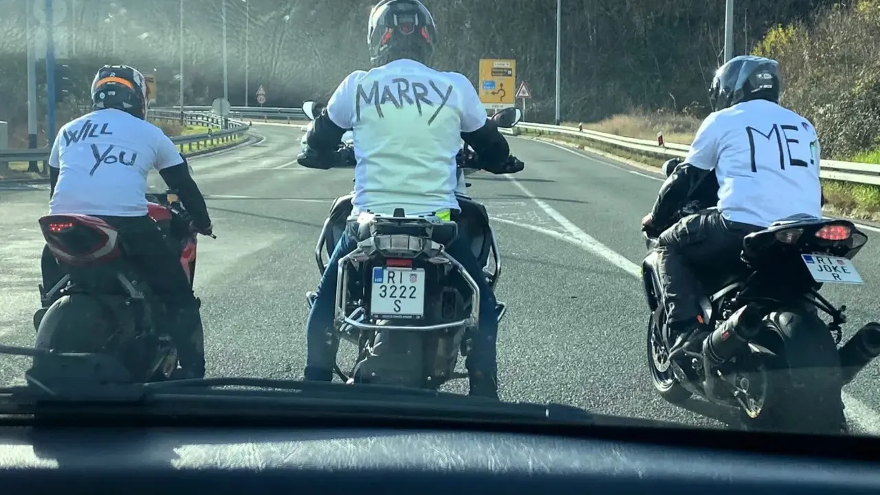 U njegovu naumu pomogli su mu prijatelji koji su se s njime provozali snažnim motociklima riječkom obilaznicom jedan do drugoga upravo u trenutku dok se istim putem otputio i prijatelj s budućom mladom u automobilu. Dečki na motorima pritom su nosili majice s natpisima koji su, čitajući ih zajedno, formirali najvažnije pitanje u njegovu dosadašnjem životu – “Will You – Marry – Me?” odnosno “Hoćeš li se udati za mene?”.