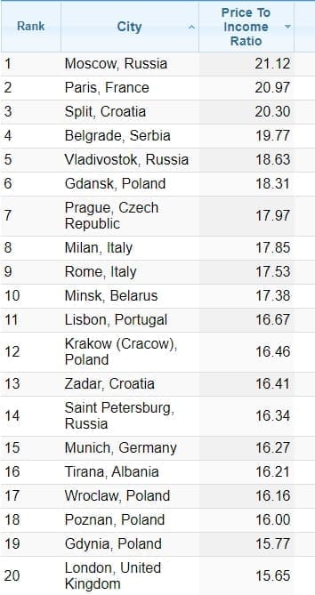 Zanimljivo je da je London, koji ima reputaciju grada s nepodnošljivo visokim cijenama stanovanja, tek na 20. mjestu, s omjerom od 15.65.