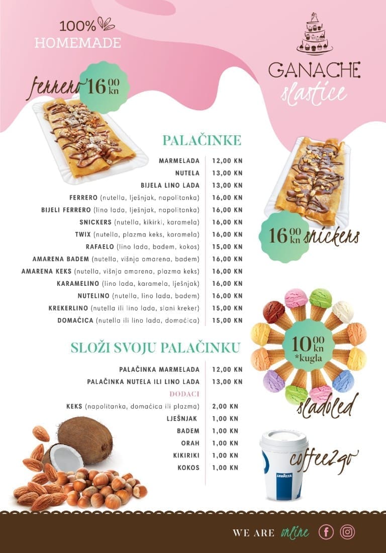 “…pa su tako i palačinke "ka domaće" od brašna, jaja, mlijeka i šećera, a da bi bile savršene uvik nabavljamo Nutellu proizvedenu u Njemačkoj, a cijena im je da ni doma nećete proć jeftinije - 13kn dvi palačinke. Dođite i probajte, samo pazite da se ne navučete! ” -veselo komentiraju iz slastičarnice Ganache.