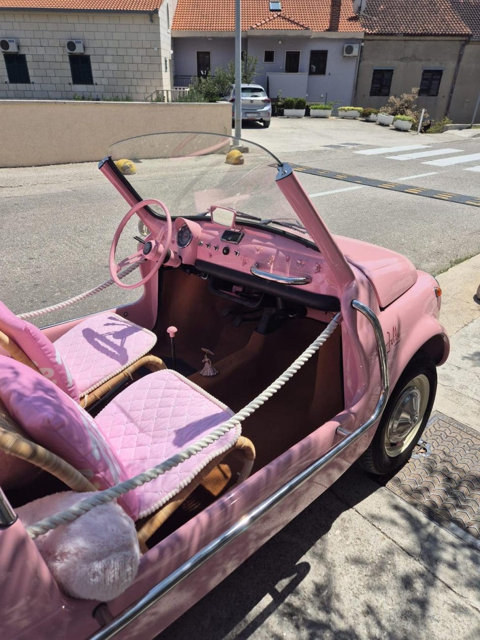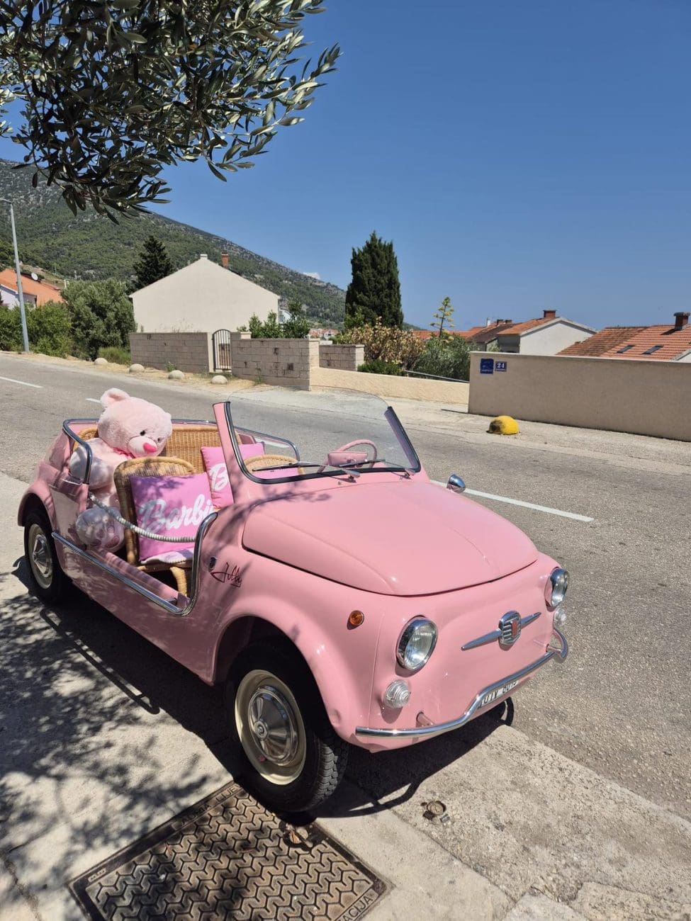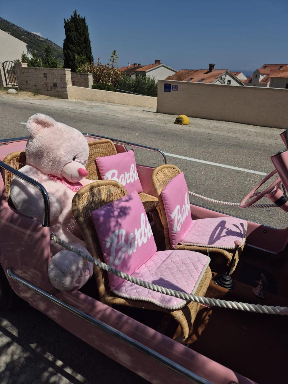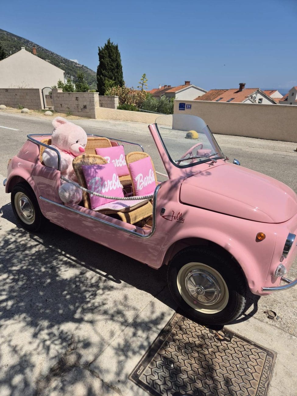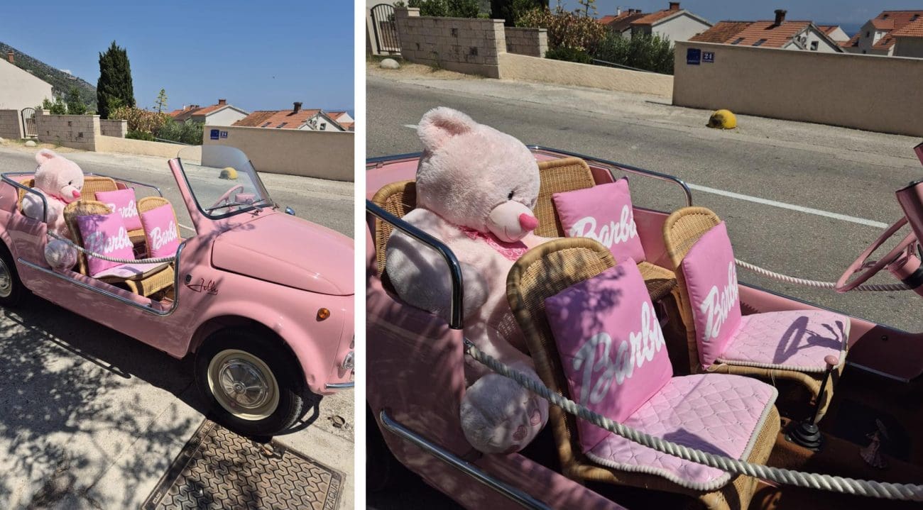 Ako ste se ovih dana zatekli u Bolu na otoku Braču, velika je šansa da vam pogled nije mogao pobjeći od najslađeg prizora ljeta, vintage ružičastog kabrioleta u kojem dominiraju jastuci s natpisom "Barbie", plišani medvjedić i detalji koji izgledaju kao iz filmskog seta.