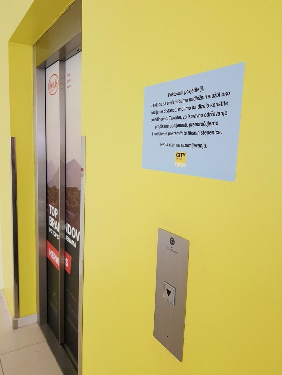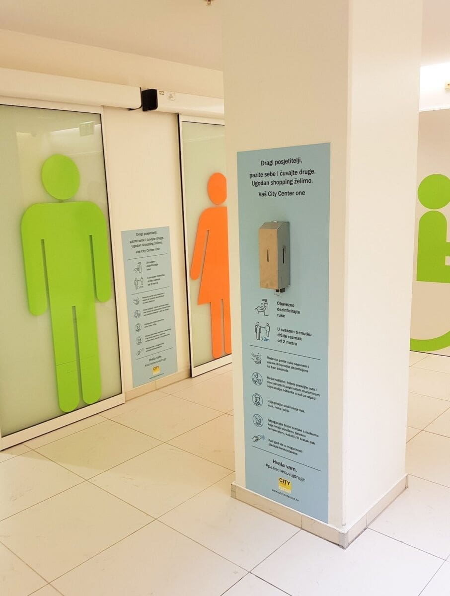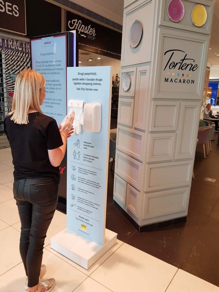 Osim toga, Centar se više puta dnevno detaljno čisti kvalitetnim dezinfekcijskim sredstvima, a veliki naglasak stavljen je na dezinfekciju dijelova s kojima posjetitelji najčešće dolaze u kontakt, poput rukohvata, tipkala i kvaka, pa je jedna osoba iz higijenske službe zadužena samo za taj dio od ukupno 20 njih koliko se dnevno brine za čistoću Centra. Kroz cijeli Centar su postavljene upute o pravilnom ponašanju, potrebnim razmacima, dezinfekciji, savjetima oko upotrebe dizala i slično, a sva mjesta za odmaranje u Centru su privremeno uklonjena.