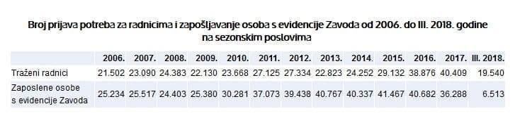 U prva tri mjeseca 2018. najviše su traženi radnici u djelatnosti pružanja smještaja, pripreme i usluživanja hrane te djelatnosti trgovine na veliko i malo ukupno 13.836 radnika, i to uglavnom konobara/konobarica, sobara/sobarica, čistača/čistačica, kuhara/kuharica, prodavača/prodavačica, sobarica, kuhinjskih radnika/kuhinjskih radnica, pomoćnih kuhara/pomoćnih kuharica, pomoćnih konobara/pomoćnih konobarica, recepcionara/recepcionarki, turističkih animatora/turističkih animatorica i dr.