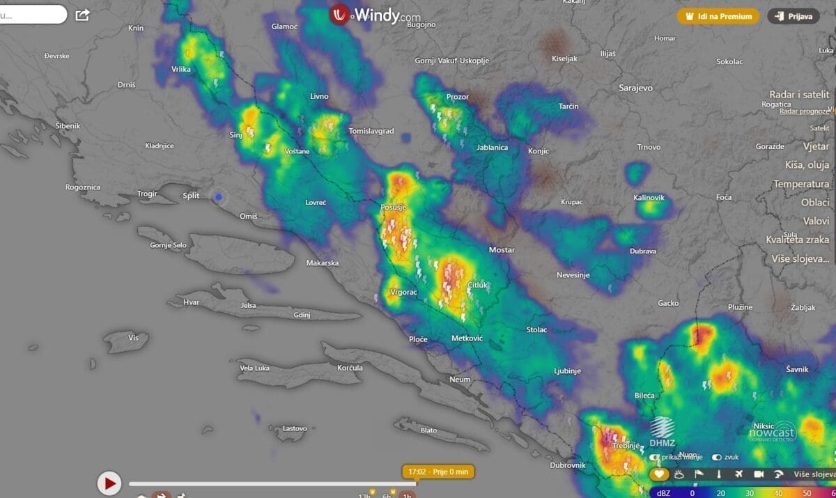 Tako je u 17 sati naoblaka s mjestimičnim pljuskovima i grmljavinom zahvatila Dinaru, Kamešnicu, dio Zagore, vrgoračkog područja, ali i Konavala.
