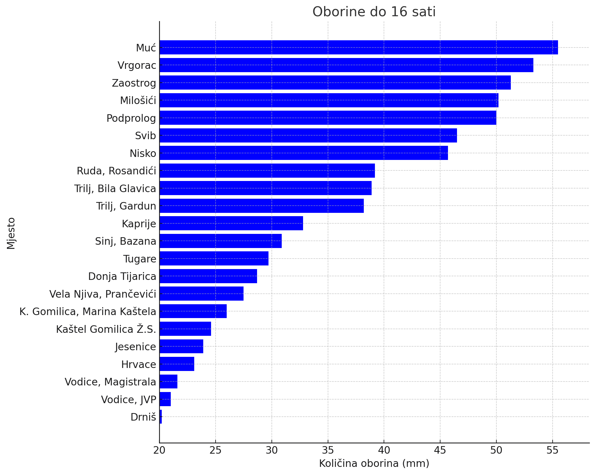 Čak 56 litara po metru kvadratnome palo je u Muću, a slijede Vrgorac 53, Zaostrog 51, Milošići i Podprolog 50, Svib 47, Nisko 46, Ruda 39, Trilj 38, Sinj 31, Tugare 30 itd.