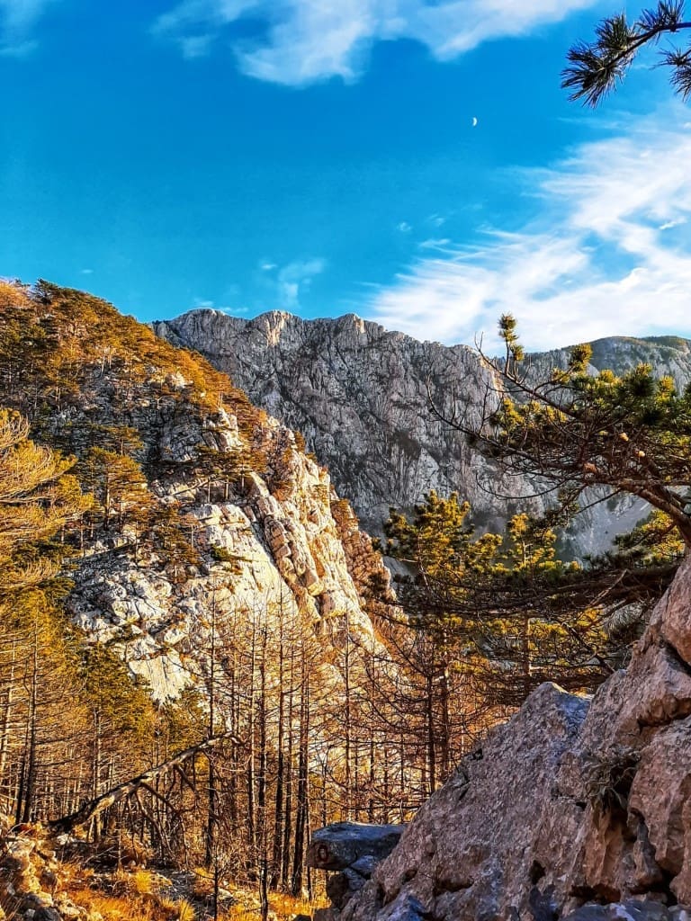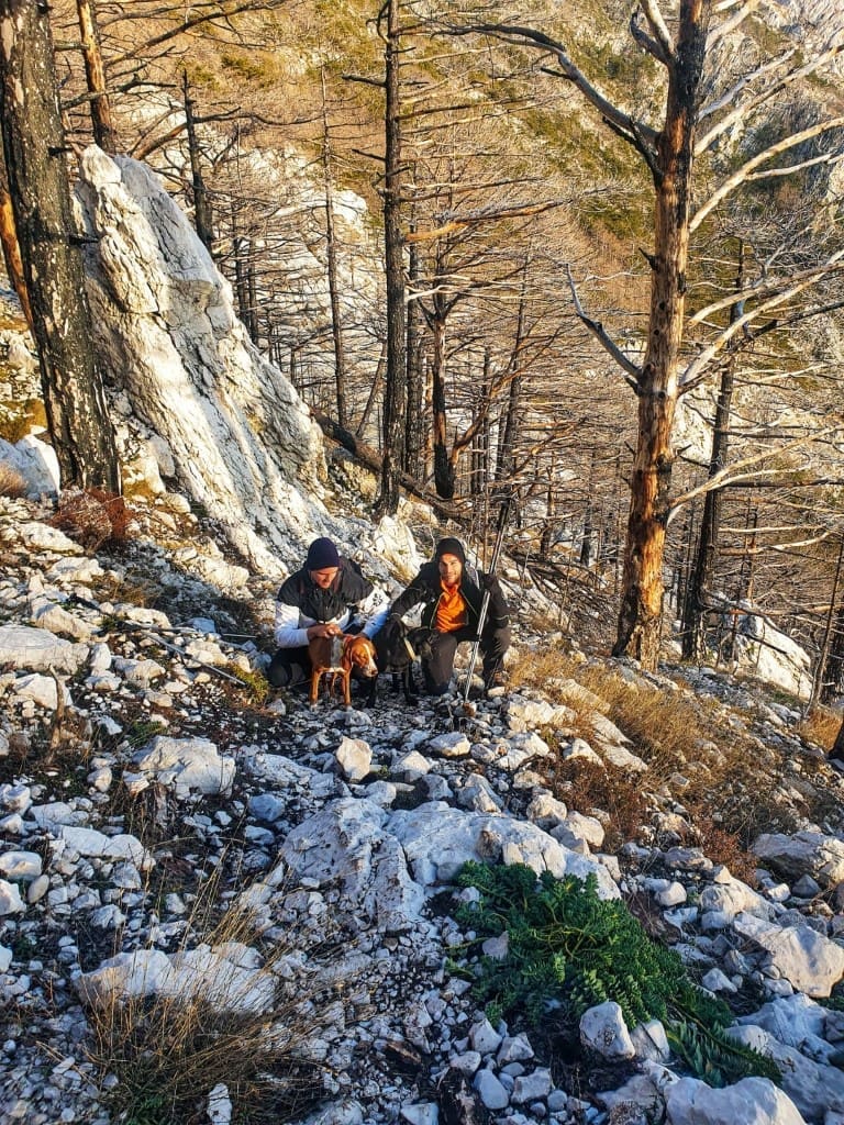 Nakon skretanja, planinarska staza se počinje oštrije spuštati, ubrzo ulazi u visoku borovu šumu na području Borovika a nakon toga stiže do planinarskog skloništa na Osičinama. Ovo planinarsko sklonište se zaključava a za ključeve se treba obratiti planinarskom društvu iz Baške Vode.