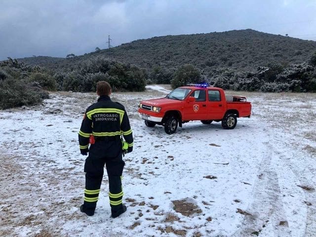 Na širem dubrovačkom području snijeg povremeno pada već drugi dan zaredom, a u utorak je iznenadio dijelove Lastova, Korčule, Pelješca, pa čak i Mljeta odakle dolazi pomalo bizarna vijest da je HGSS spašavao osobu koja je slomila nogu na snijegu.