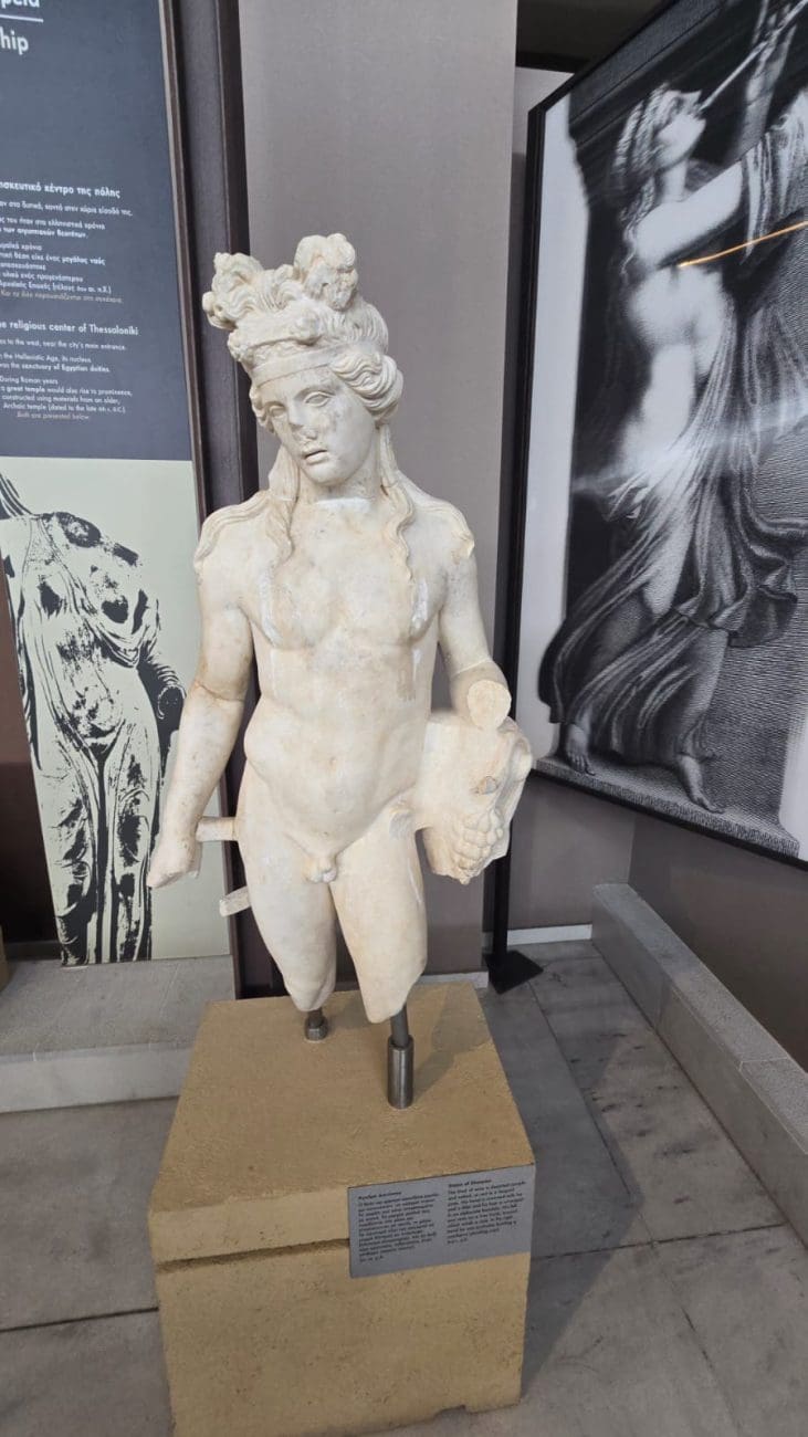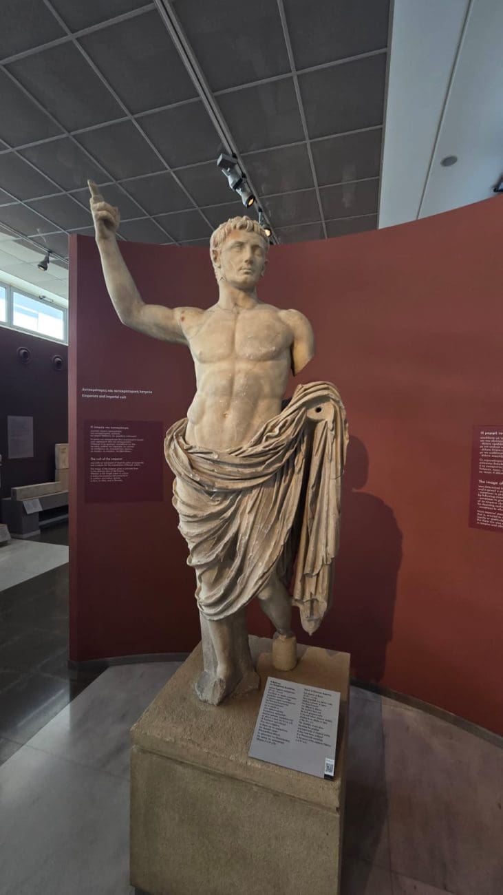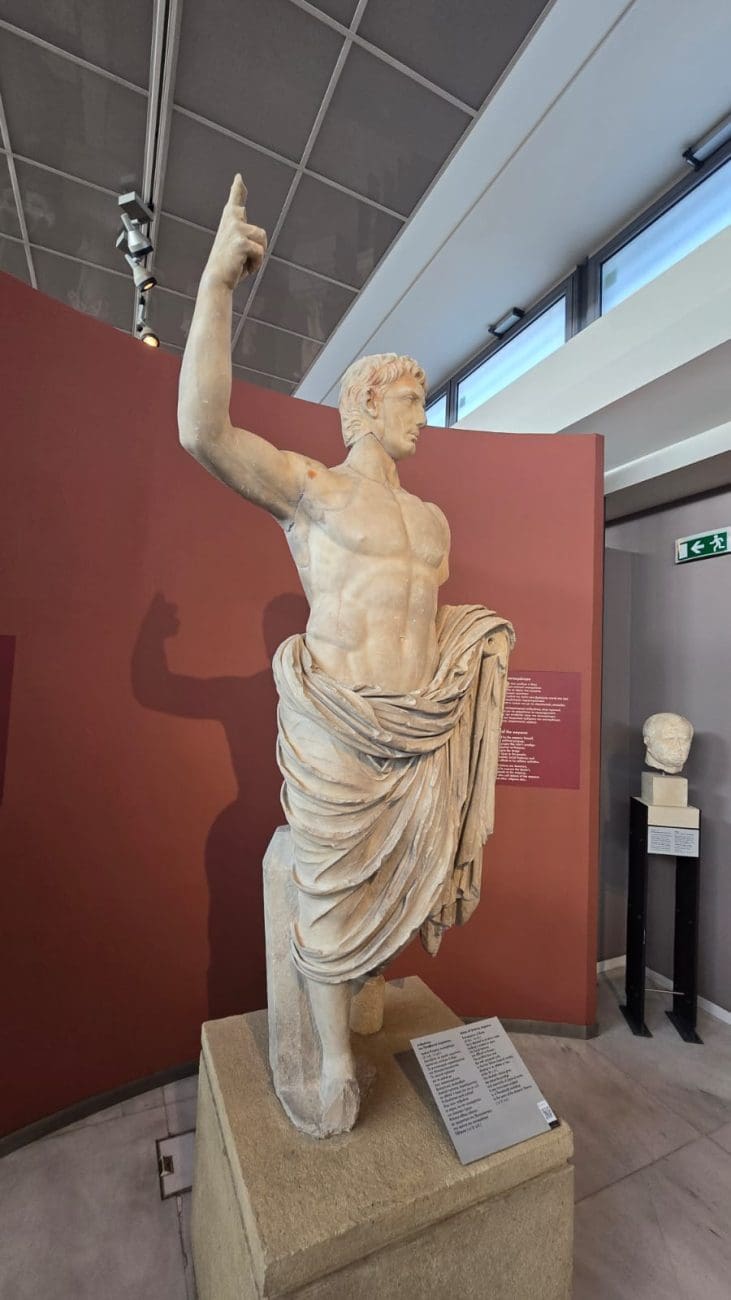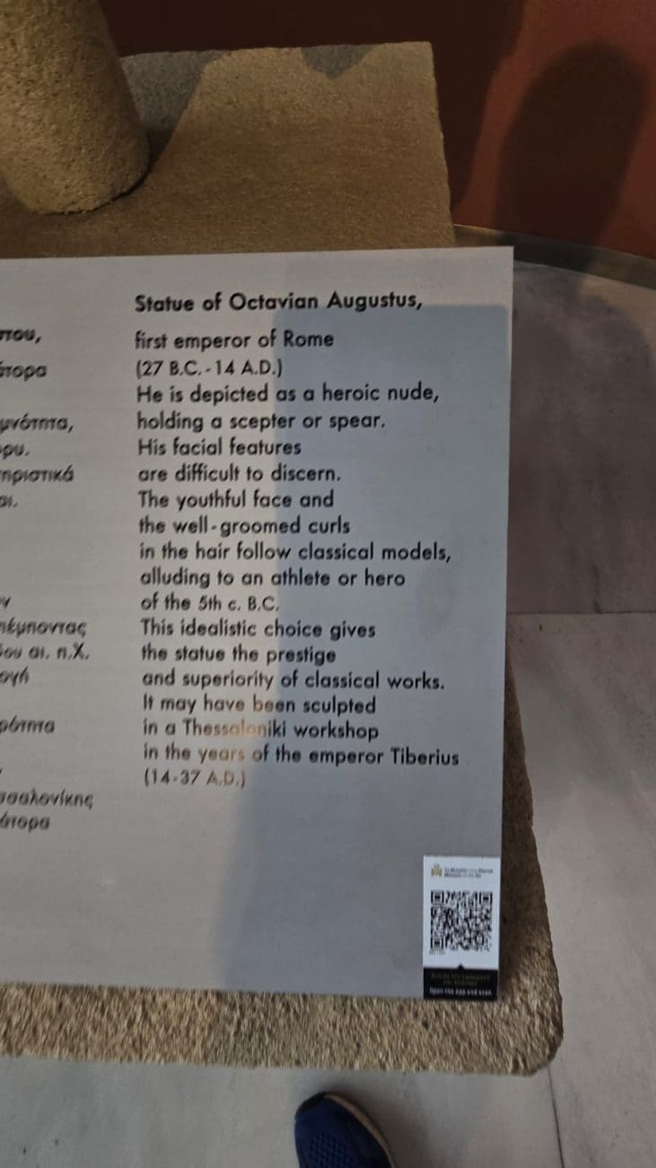Muzej nudi i bogatu zbirku rimskih mozaika, skulptura i predmeta iz svakodnevnog života u Solunu, kao i neolitičke i brončanodobne nalaze koji svjedoče o tisućljetnom kontinuitetu života u sjevernoj Grčkoj. Osim stalnog postava, posjetitelji mogu vidjeti izložbe o religijskim običajima, kovanju novca i kultu Dioniza, uz digitalne rekonstrukcije koje dodatno približavaju prošlost. Muzej je nezaobilazno mjesto za razumijevanje povijesti Makedonije i Grčke. Meni je posebno bilo zanimljivo vidjeti spominjanje cara Dioklecijana. Car Dioklecijan (vladao 284.–305.) spominje se u kontekstu antičke Grčke najčešće u vezi s njegovim velikim reformama Rimskog Carstva, a posebno s ekonomijom i trgovinom. Krajem 3. stoljeća Carstvo je bilo u teškoj krizi – česte uzurpacije, pad vrijednosti novca i prekid trgovačkih putova ozbiljno su pogodili provincije, uključujući grčke gradove poput Soluna i Atene. Dioklecijan je zato proveo nekoliko ključnih mjera, među ostalim znameniti Edikt o cijenama (Edictum de Pretiis Rerum Venalium, 301. g.) – pokušaj da se suzbiju inflacija i špekulacije u trgovini. Edikt je propisivao maksimalne cijene za više od tisuću proizvoda i usluga, od hrane i vina do odjeće i prijevoza. Budući da su grčki gradovi bili veliki trgovački centri, posebno Solun kao luka na Via Egnatii, ovaj edikt izravno je utjecao na trgovinu u Grčkoj. Druga stvar koja me oduševila bio je impresivni kip rimskog cara Augusta Oktavijana, upravo onoga koji je pokorio tvrdoglavo ilirsko pleme Delmate, nakon čega je Ilirik dobio naziv Dalmacija.