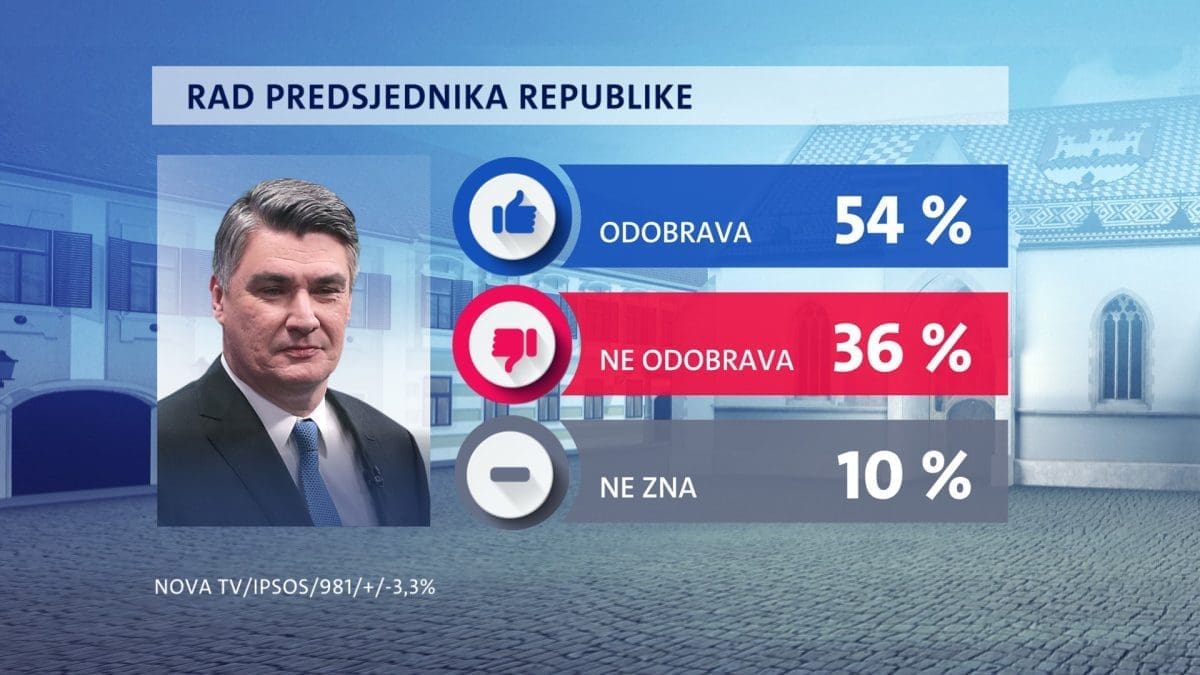 Predsjednik Milanović može biti zadovoljan. Većina građana, njih 54 posto, podupire ga u radu. Mjesec prije taj broj je bio 45 posto. Ne podupire ga 36 posto, ne zna njih 10 posto. Ovo je treći najbolji rejting u godinu dana.