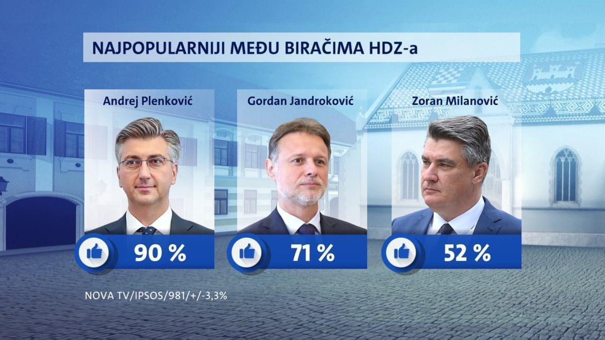 HDZ-ovim biračima i dalje je prvi izbor Andrej Plenković s 90 posto potpore. Potom Gordan Jandroković sa 71 posto i prvi put među biračima vodeće stranke Zoran Milanović bio bi treći izbor s 52 posto.