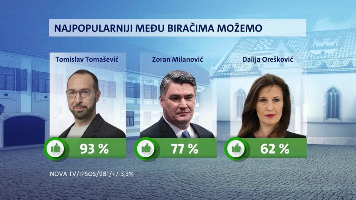 Tomislav Tomašević je lider lijevo-zelene koalicije s 93 posto, zatim je tu Zoran Milanović sa 77 posto i na kraju Dalija Orešković sa 62 posto.