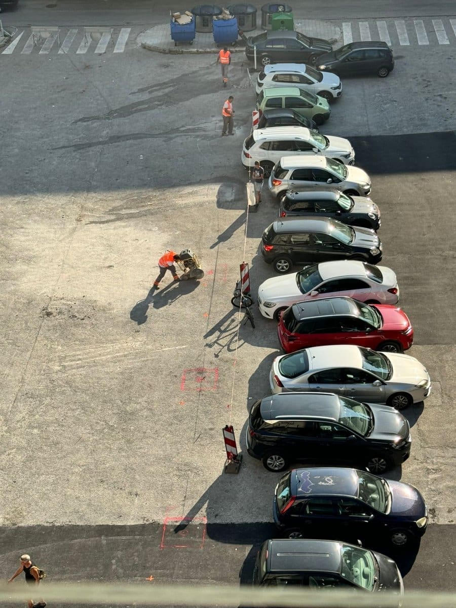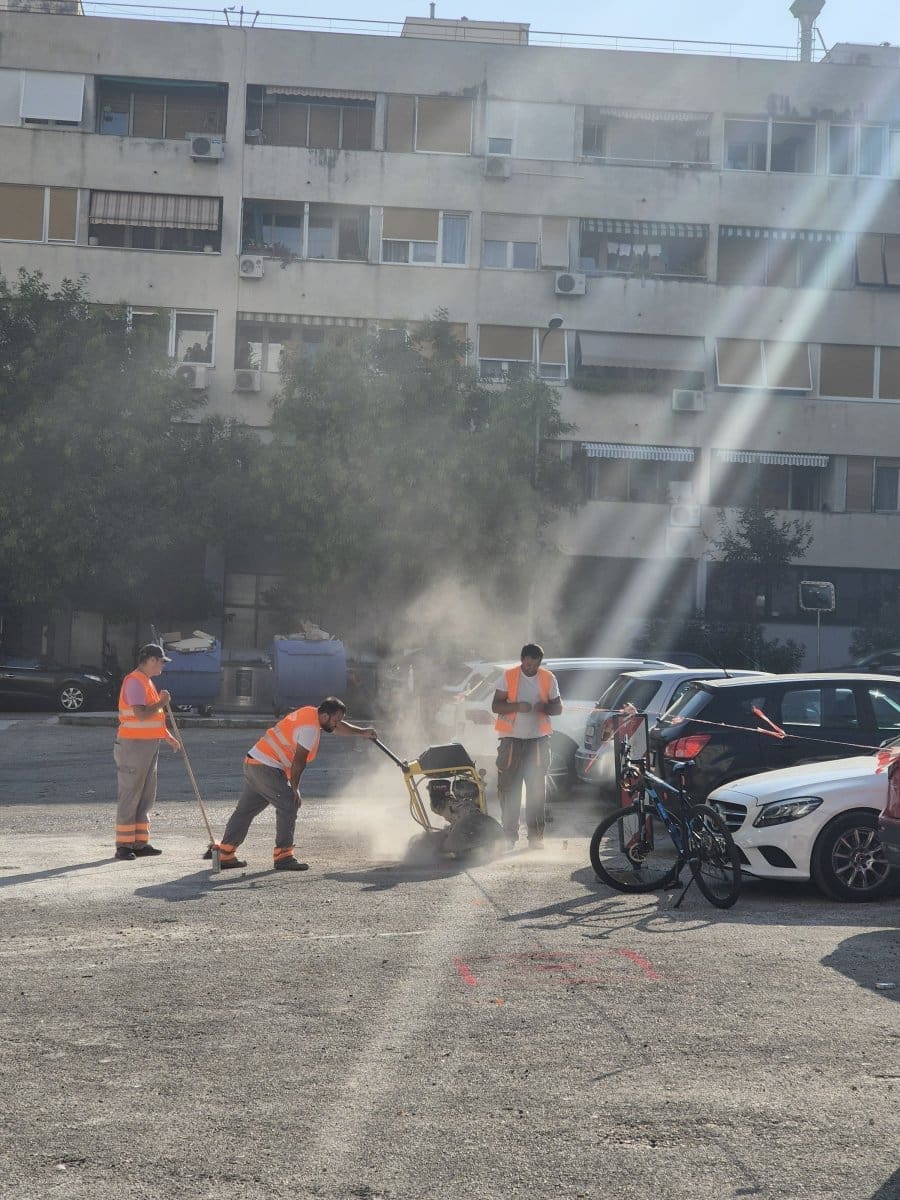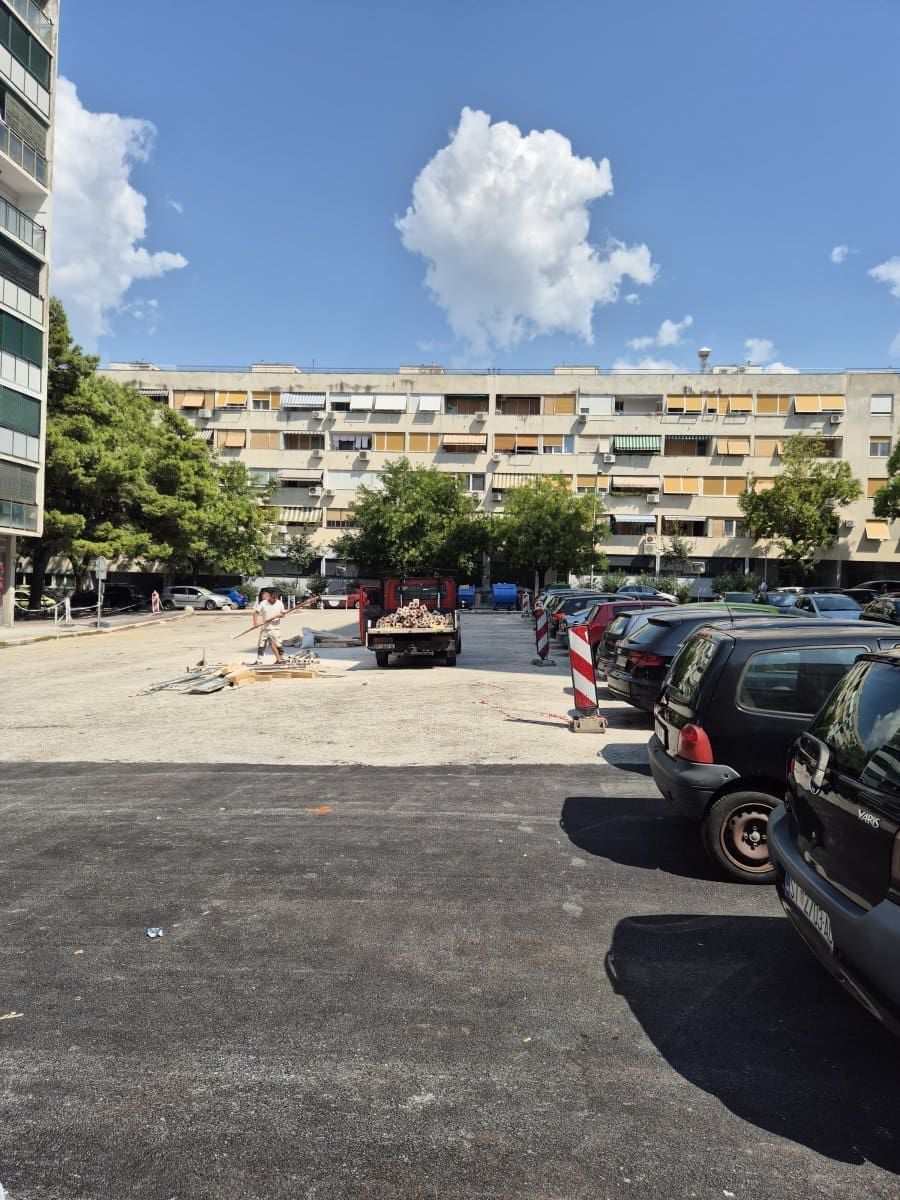 Parkiralište je bilo ograđeno tijekom sanacija, popravljene su - to jest, asfaltirane - i rupe na parkiralištu, a radnici cestara upravo pilaju, pa kopaju mjesta za posaditi stabla!