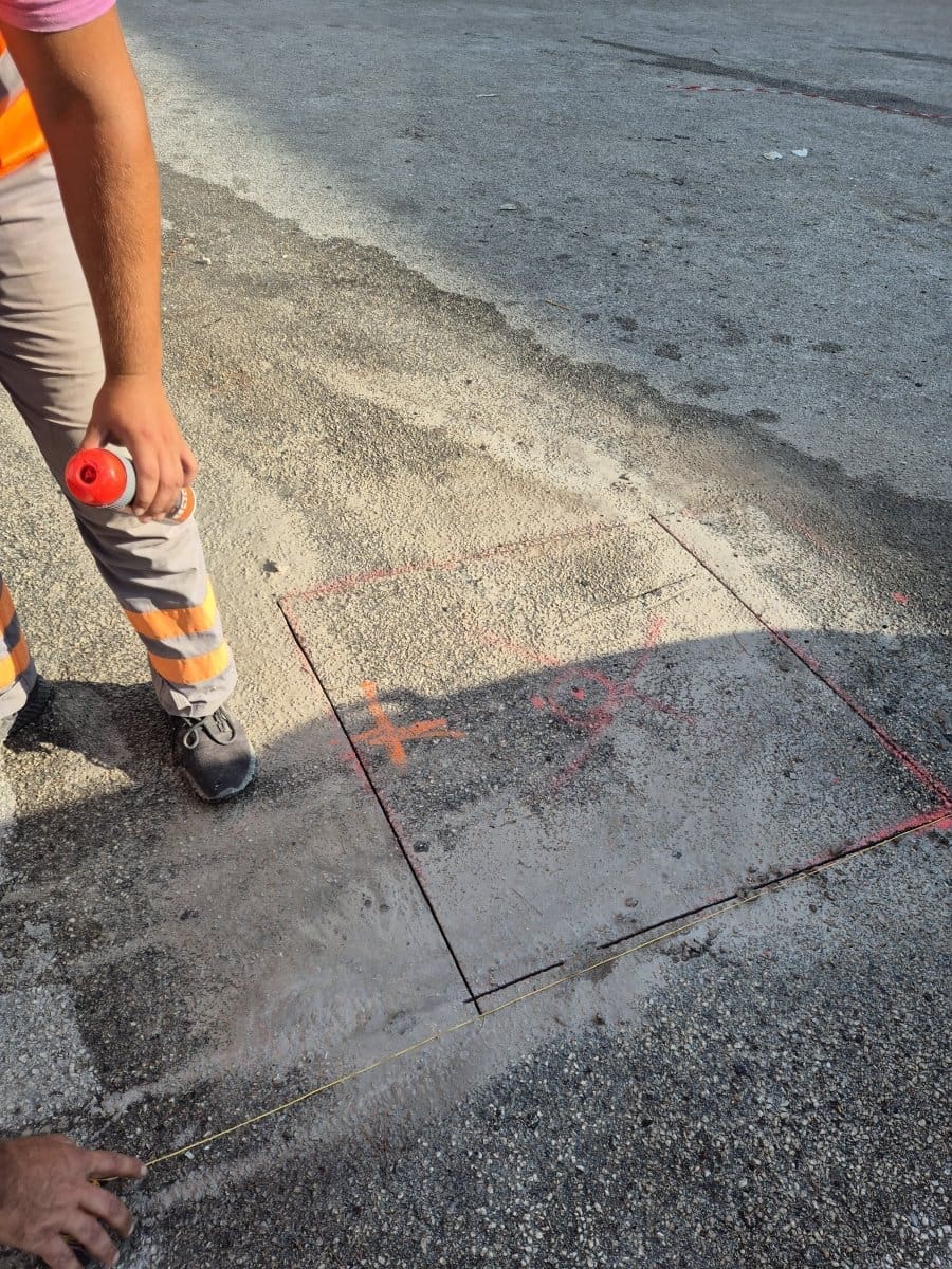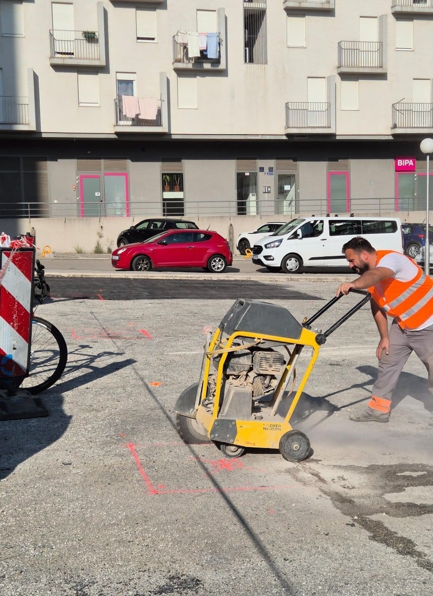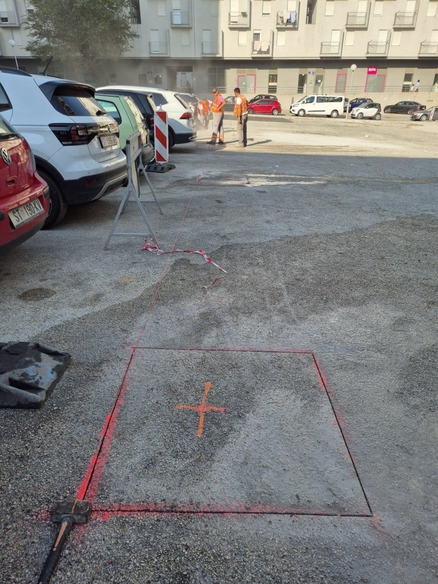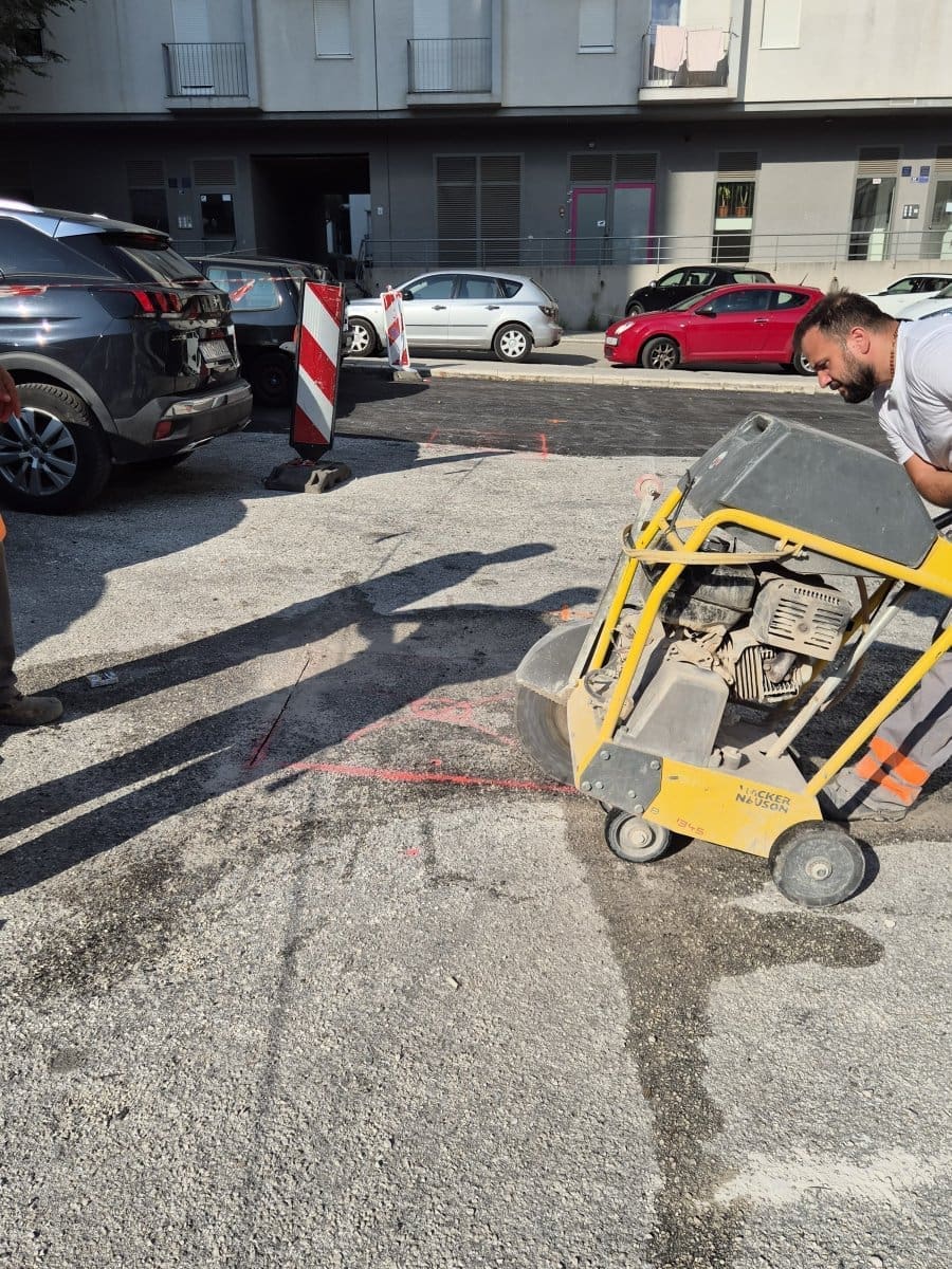 Parkiralište je bilo ograđeno tijekom sanacija, popravljene su - to jest, asfaltirane - i rupe na parkiralištu, a radnici cestara upravo pilaju, pa kopaju mjesta za posaditi stabla!