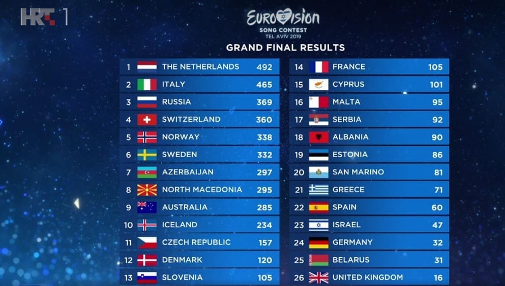Nizozemska je u konačnici dobila 492 boda publike i žirija. Na drugom mjestu je bila Italije, a slijede Rusija, Švicarska, Norveška, Švedska, Azerbejdžan, Sjeverna Makedonija, Australija i Island.