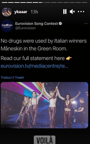 Polemike oko tzv. drogiranja Damiana Davida iz grupe Måneskin jučer su okončane. Kako stoji u službenoj izjavi Europske radiotelevizijske unije, 22-godišnji Rimljanin danas je obavio test na droge, na kojem je on sam inzistirao još od konferencije za novinare u nedjelju u 1:00 sat, te koji se ispostavio negativnim na korištenje opasnih supstanci.