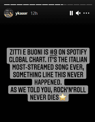 No potom je objavio informaciju vezanu uz popularnost pjesme njegovog benda koja je na YouTubeu jutros dosegla 24 milijuna pregleda. Naime, radio se o najvećenijoj talijanskoj pjesmi na servisu Spotify ikada!