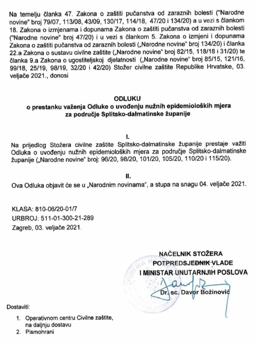 Kako stvari stoje od danas, 4. veljače, sve epidemiološke mjere za područje Splitsko-dalmatinske županije prestale su važiti! Dakle, ukinuta je zabrana rada teretana i kafića, zabrana okupljanja, posjete starima i nemoćnima u domovima...