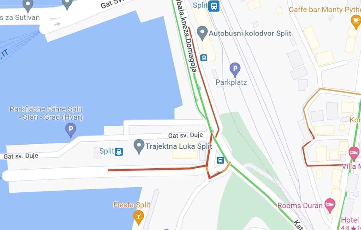 Prema podacima aplikacije Google maps, povećana je gužva i prometni je krkljanac u većem dijelu trajektne luke. No, ovaj prizor na samom početku vikenda ipak nije nepoznanica mnogim Splićanima.