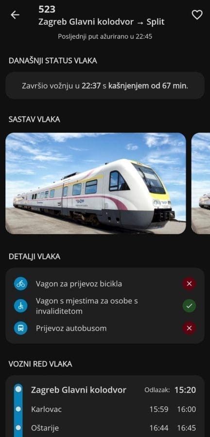 Putnički vlak 523 koji je jučer iz Zagreba krenuo za Split u 15:20 po voznom redu trebao je stići u Split u 21:30. Uobičajena kašnjenja na ovoj relaciji su 20 do 30 minuta, no ovoga puta vlak je došao u 22:37, što je 67 minuta duže od planiranog.
