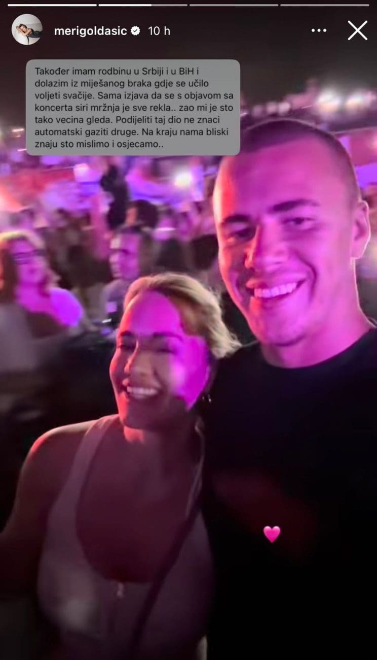 Također imam rodbinu u Srbiji i u BiH i dolazim iz miješanog braka gdje se učilo voljeti svačije. Sama izjava da se s objavom sa koncerta širi mržnja je sve rekla... Žao mi je što tako većina gleda. Podijeliti taj dio ne znači automatski gaziti druge. Na kraju nama bliski znaju što mislimo i osjećamo...'', napisala je.