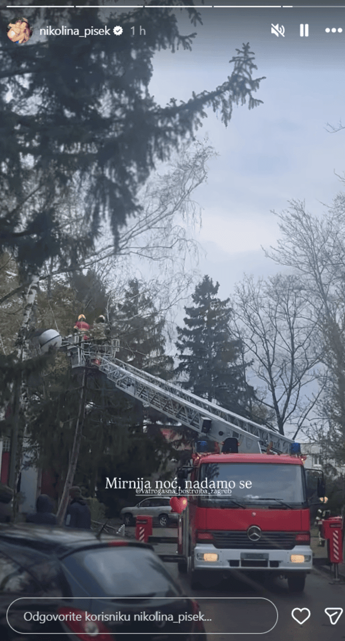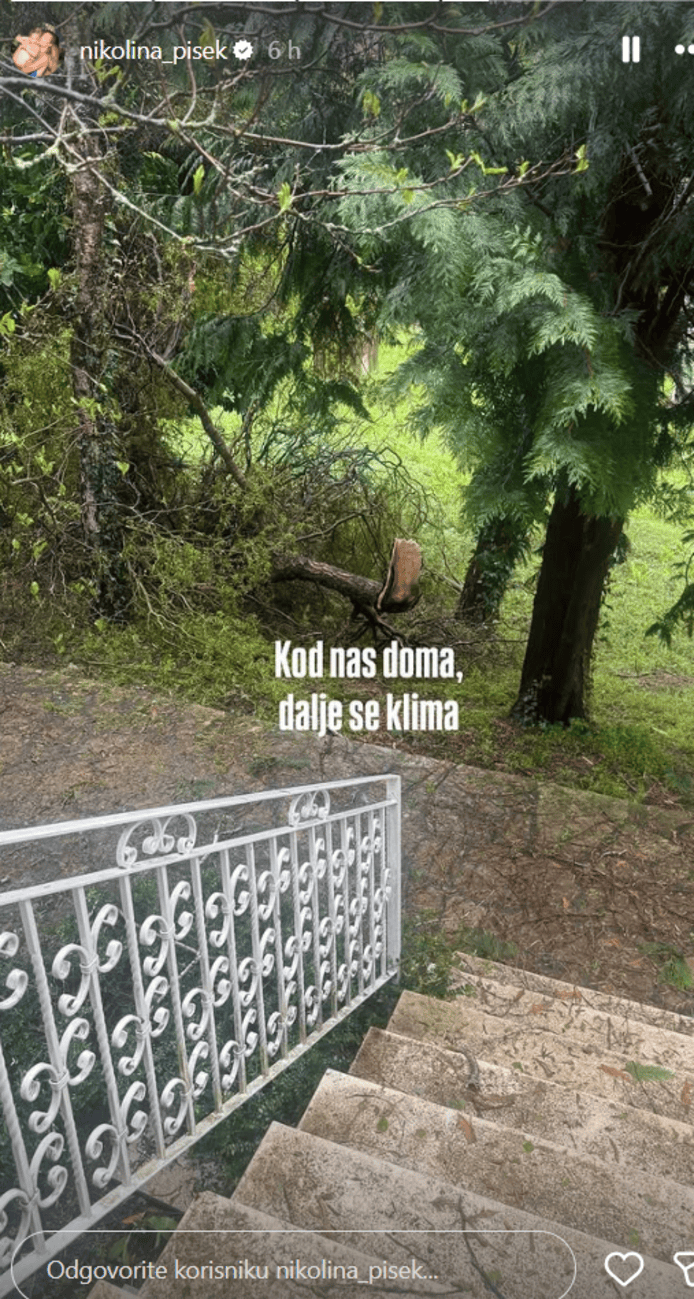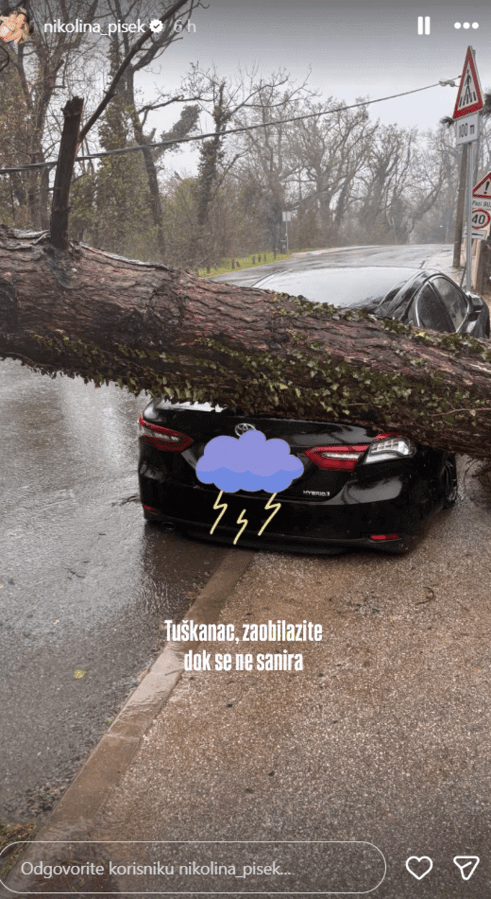 Na fotografijama se vidi crni automobil oštećen nakon što se na njega srušilo stablo, a Pišek je pritom upozorila pratitelje da izbjegavaju područje Tuškanca dok se situacija ne sanira. Osim toga, snimke iz njenog dvorišta pokazuju kako su vjetar i grmljavina nanijeli velike štete u okruženju