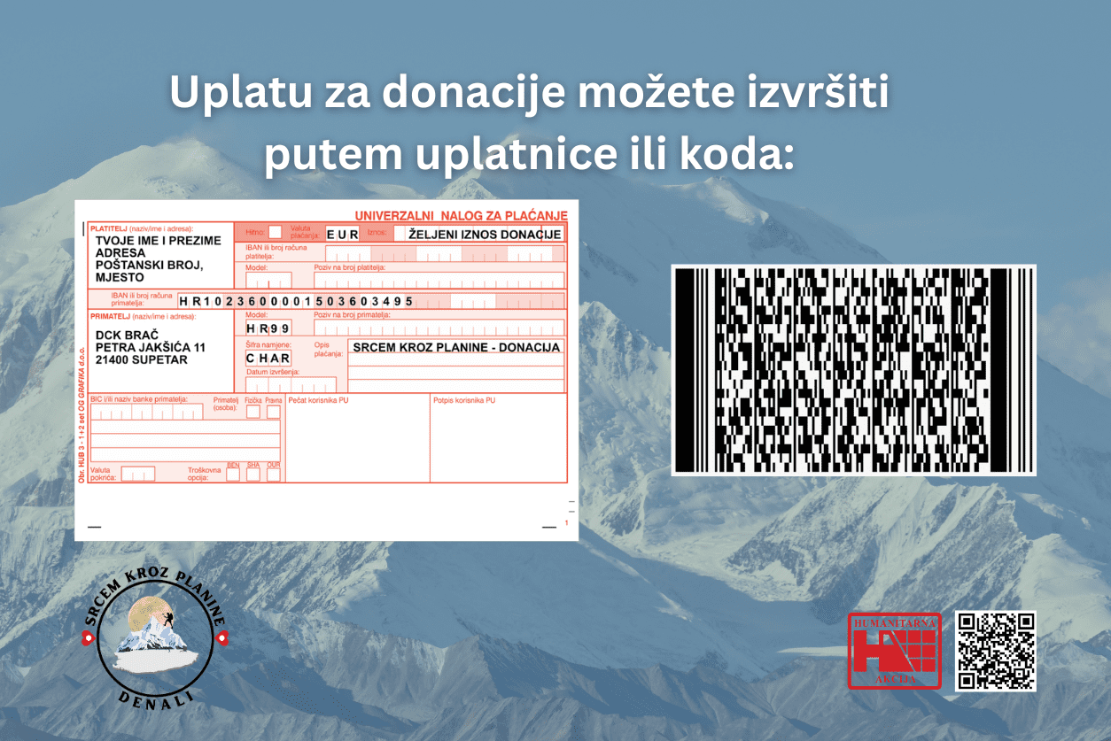 Svi građani mogu postati dio ove inspirativne priče, kroz donacije na račun koji je otvoren u svrhu humanitarne akcije „Srcem kroz planine“ pri Društvu Crvenog križa Brač, Petra Jakšića 11, 21400 Supetar, OIB: 22045187327, Zagrebačka banka d.d., IBAN: HR1023600001503603495, a uplatu je moguće izvršiti i putem bar koda: