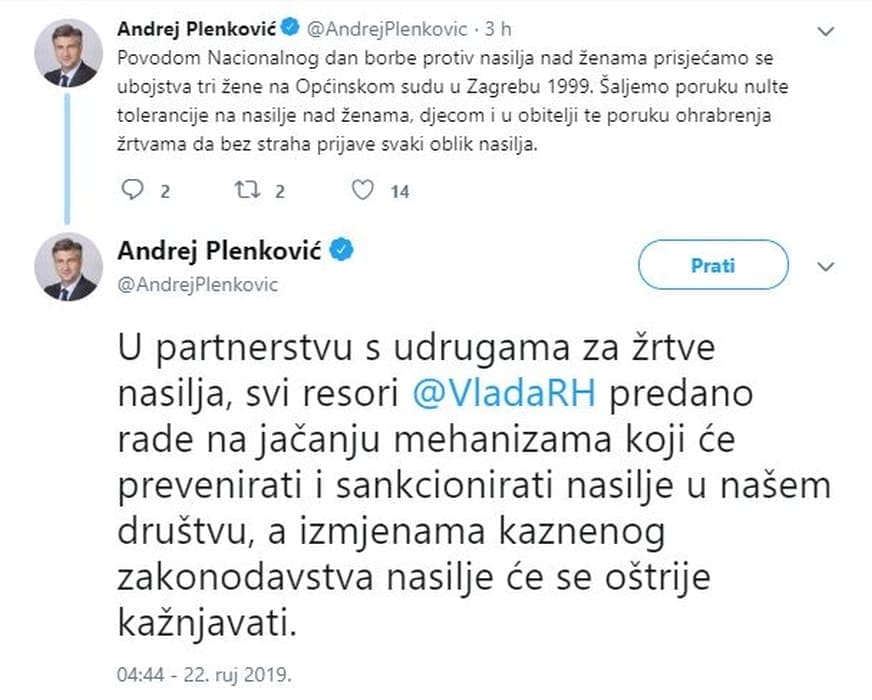 Predsjednik Vlade Andrej Plenković u povodu Nacionalnog dana borbe protiv nasilja nad ženama uputio je poruke u kojima poziva žrtve da prijave svaki oblik nasilja.