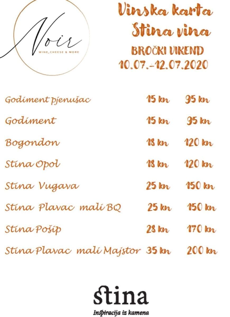 U nekoliko prethodnih mjeseci rada ostvarili smo izuzetnu suradnju s vinarijom Stina, s ljudima koji su poput nas sanjari, koji su usred kamena odlučili napraviti vinograde koji su rodili nevjerojatnim plodom. U poljima prekrivenim stinom, na okomitim stinama iznad mora, radi se vino koje ne umije nositi nijedno drugo ime no – Stina. Prkosna pri nastajanju, puna ljubavi pri svakom kušanju, ovog vikenda će obogatiti naš gastro menu. Bročki specijaliteti nude se u ribljem i mesnom meniju po pristupačnoj cijeni od svega 120 kn, rekli su nam iz Noira.