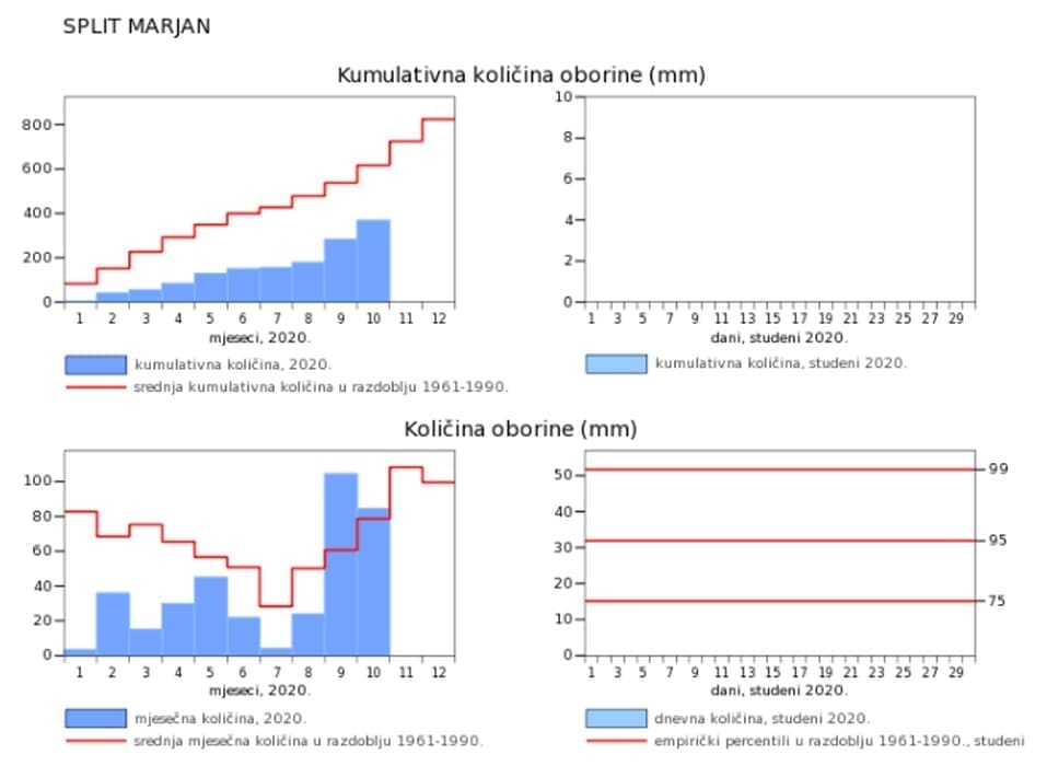 Studeni je posljednji mjesec klimatološke jeseni. Spada među hladnije mjesece u godini, a prosječno je najkišovitiji u godini na našem području. Ne samo da oborina nije bilo u dosadašnjem tijeku studenog, nego ih zapravo nema na vidiku sljedećih desetak dana, bar ne konkretnijih.