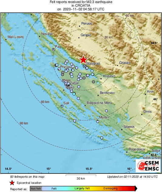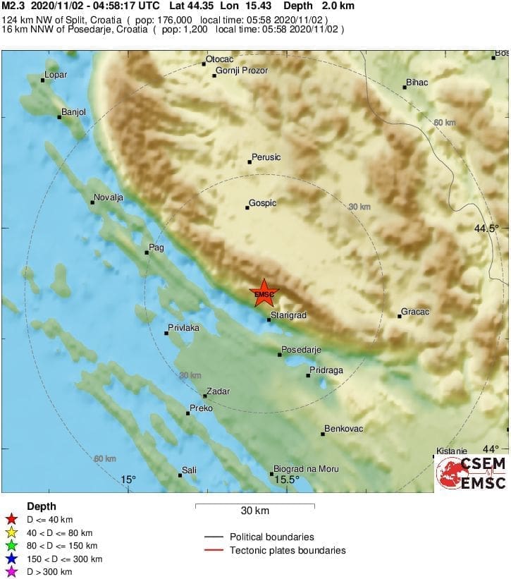 Jutros u 5 sati i 58 minuta zabilježen je slab potres magnitude 2.3 po Richteru na istom području koje je jučer bilo pogođeno potresom. Epicentar je bio 16 kilometara sjeverozapadno od Posedarja.