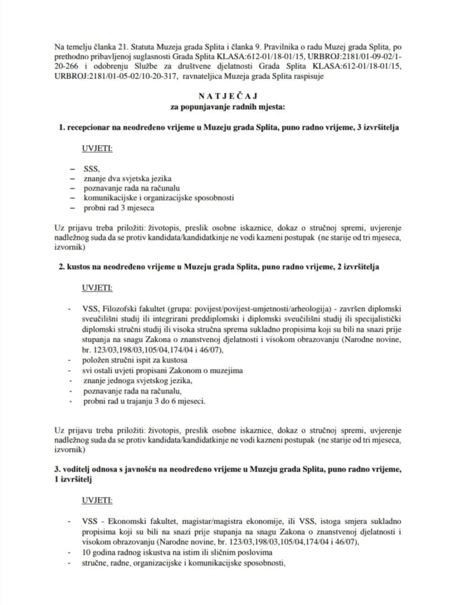 Posebno su intrigantni uvjeti koje mora zadovoljavati kandidatkinja (ili kandidat, he-he) za PR službu Muzeja: traži se dakle isključivo VSS - Ekonomski fakultet, deset godina radnog iskustva na sličnim poslovima te znanje jednog stranog jezika, između ostalog. Što je izazvalo posebno živahnu raspravu na Facebook profilu gradskog vijećnika stranke Pametno, Jakova Prkića, koji već tradicionalno traži dlaku u jajetu po raznim natječajima i ponudama koji dolaze iz Banovine. Dobro, u ovom slučaju je Muzej grada Splita u pitanju, no Grad Split je ipak osnivač pa potpada u domenu Prkićevog zanimanja. Naravno, većini je propisana specifikacija za voditelja odnosa s javnošću muzeja zapela za oko, kao da je radno mjesto namješteno kako bi netko zadovoljio uvjete. Napose sad što će glasnogovornik muzeju, pored toliko zaposlenih i uz strašan medijski interes, imati obaveza kao glasnogovornik Uskoka ili SOA-e.