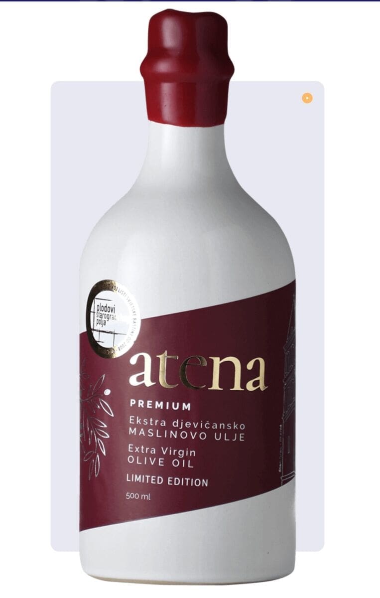 Atena Premium je visokokvalitetno ekstra djevičansko maslinovo ulje od maslina Oblica, Lastovka i Levatinka koje je na ovogodišnjem natjecanju osvojilo prestižnu zlatnu medalju. Ulje se može pohvaliti voćnom aromom srednjeg do visokog intenziteta, kombinirajući maslinovu i zelenu travu s primjesom jabuke i rajčice. Ostavlja očaravajući okus badema s primjesom artičoke i rikole.