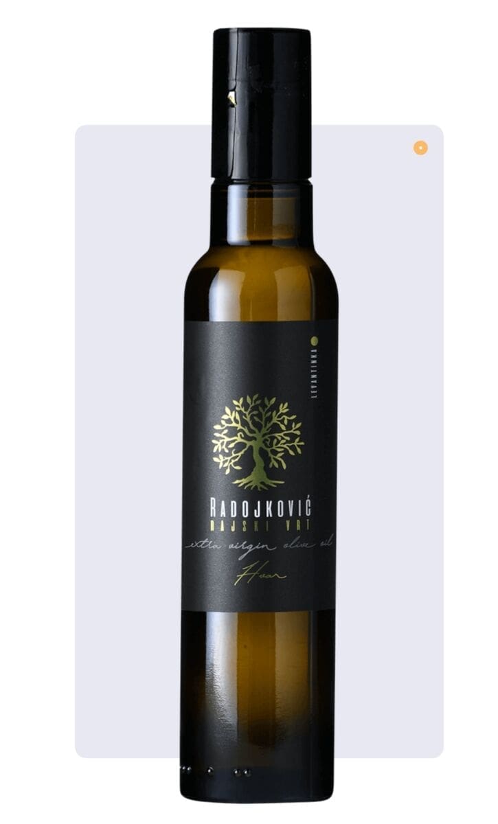 Radojković Forms: miješani je EVOO koji se razlikuje od konkurencije aromom zrelih plodova masline. Također se može pohvaliti blago začinjenim i gorkim okusom, s izraženom slatkoćom.