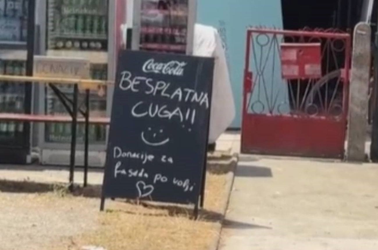 Na tom dijelu nalaze se hladnjaci sa sokovima, vodom i pivom, a ispred njih stoji ploča s natpisom: "Besplatna cuga".