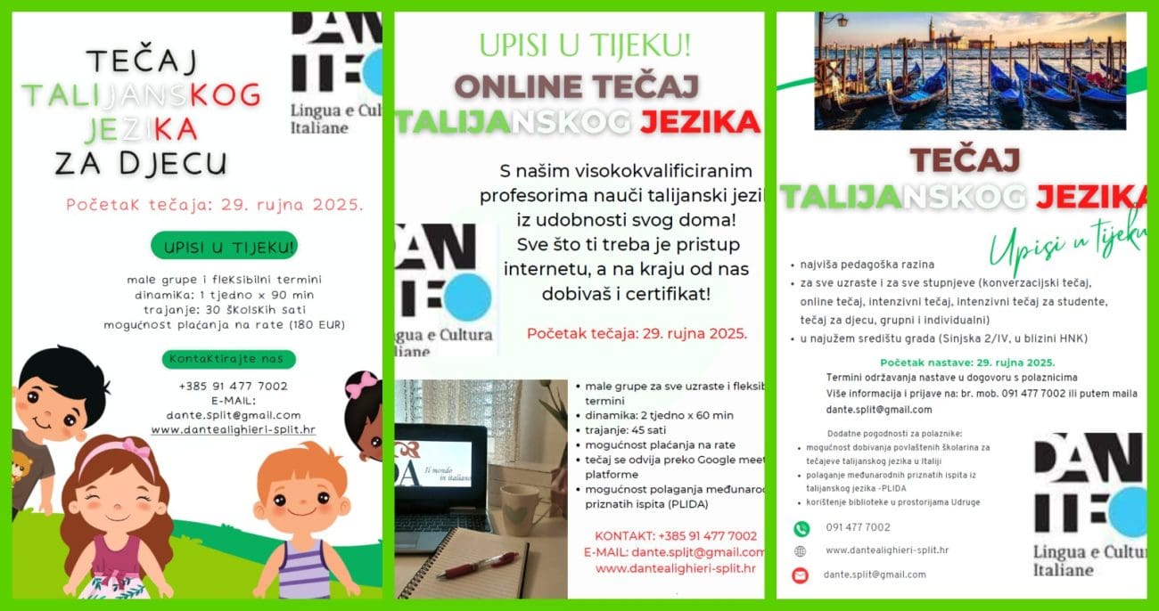 Udruga Dante Alighieri Split, smještena u Sinjskoj ulici pokraj HNK-a, i ove jeseni otvara vrata svim zaljubljenicima u talijanski jezik i kulturu. Programi su osmišljeni tako da obuhvaćaju sve uzraste i sve stupnjeve znanja, a nastava se održava na najvišoj pedagoškoj razini. Posebna vrijednost ovih tečajeva je što su prilagođeni svakome – bilo da se radi o početnicima, naprednim polaznicima, studentima ili djeci, a termini se dogovaraju s polaznicima, čime se osigurava maksimalna fleksibilnost.