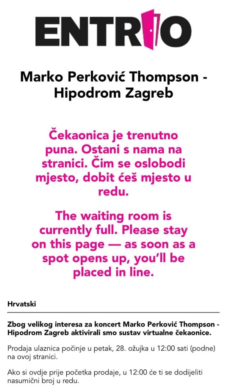 "Zbog velikog interesa za koncert 'Marko Perković Thompson - Hipodrom Zagreb' aktivirali smo sustav virtualne čekaonice. Ako si ovdje prije početka prodaje, u 12:00 će ti se dodijeliti nasumični broj u redu", piše na stranicama za prodaju ulaznica, a mnogi na ekranima imaju obavijest da je čekaonica puna.