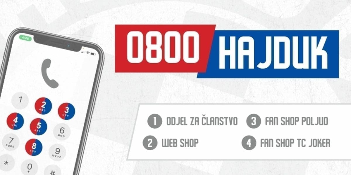 Svi članovi Hajduka, navijači, kupci, korisnici usluga od danas na raspolaganju imaju novi besplatni broj 0800-HAJDUK (0800-425385)!